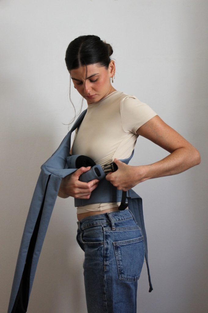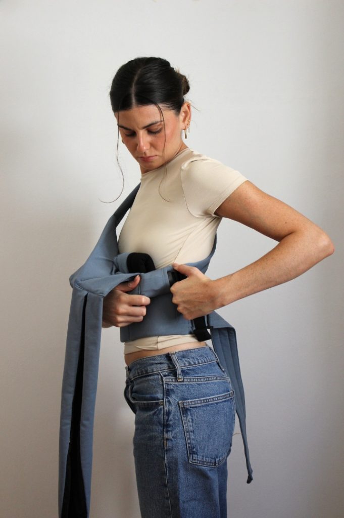 Lleva el asa izquierda sobre tu hombro izquierdo y hacia la espalda.