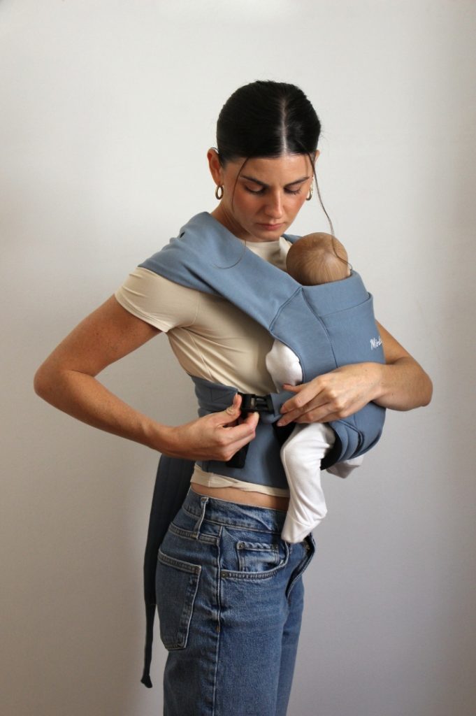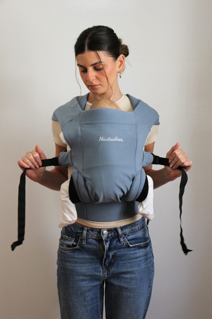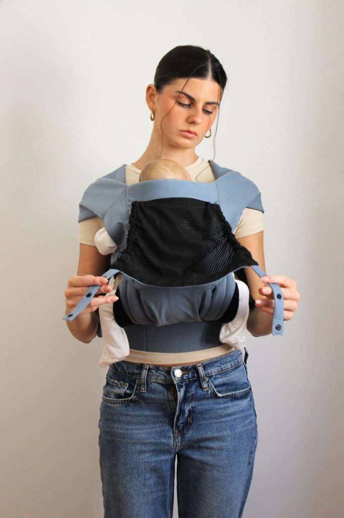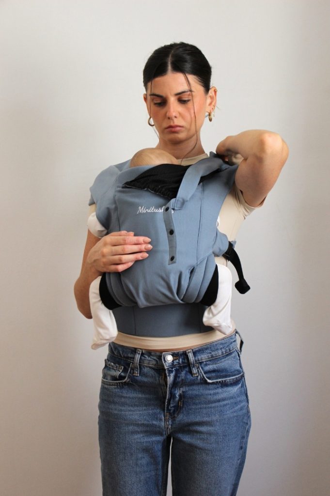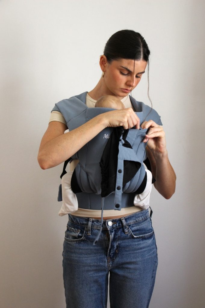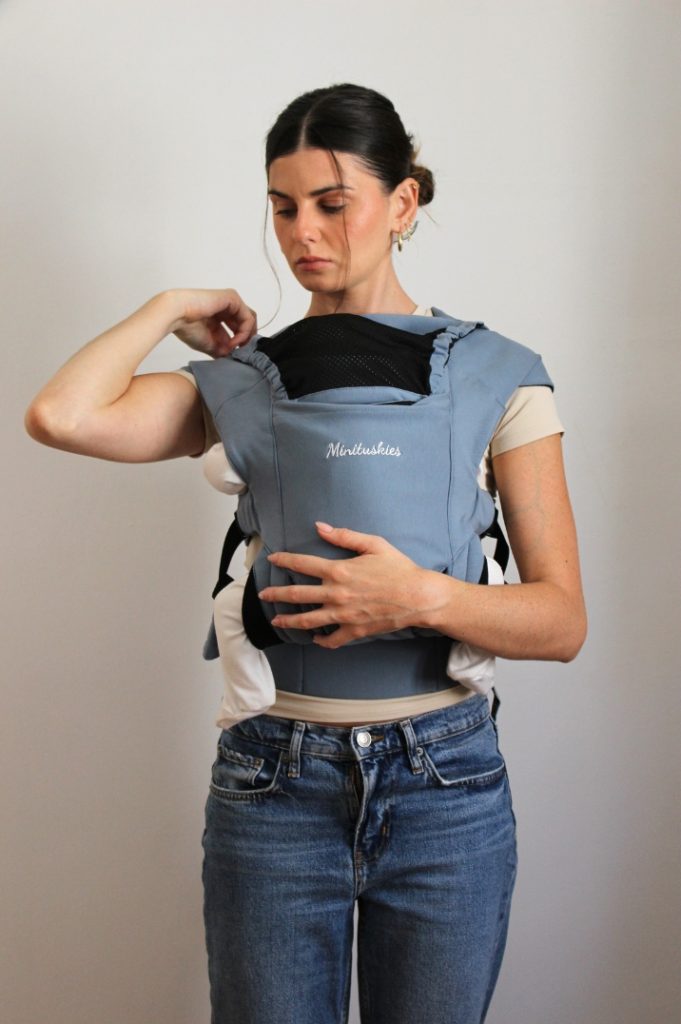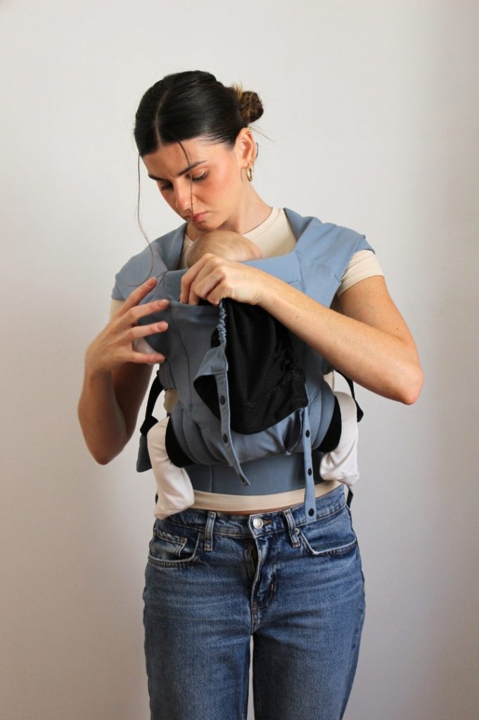 Ajusta ambas asas simultáneamente. Asegúrate de que tu peque esté cómodo y no demasiado apretado contra tu cuerpo, dejando espacio para que pueda mover la cabeza.