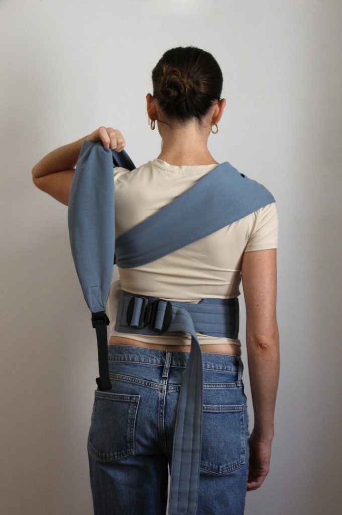 Lleva el extremo del asa hacia el lado izquierdo por detrás de la espalda.