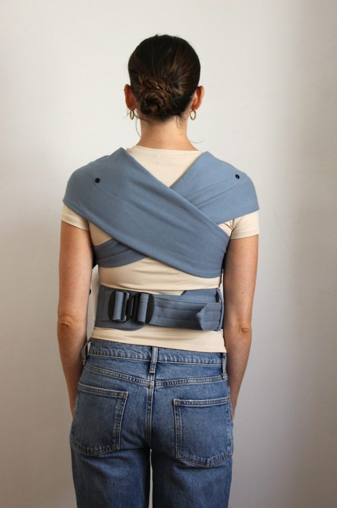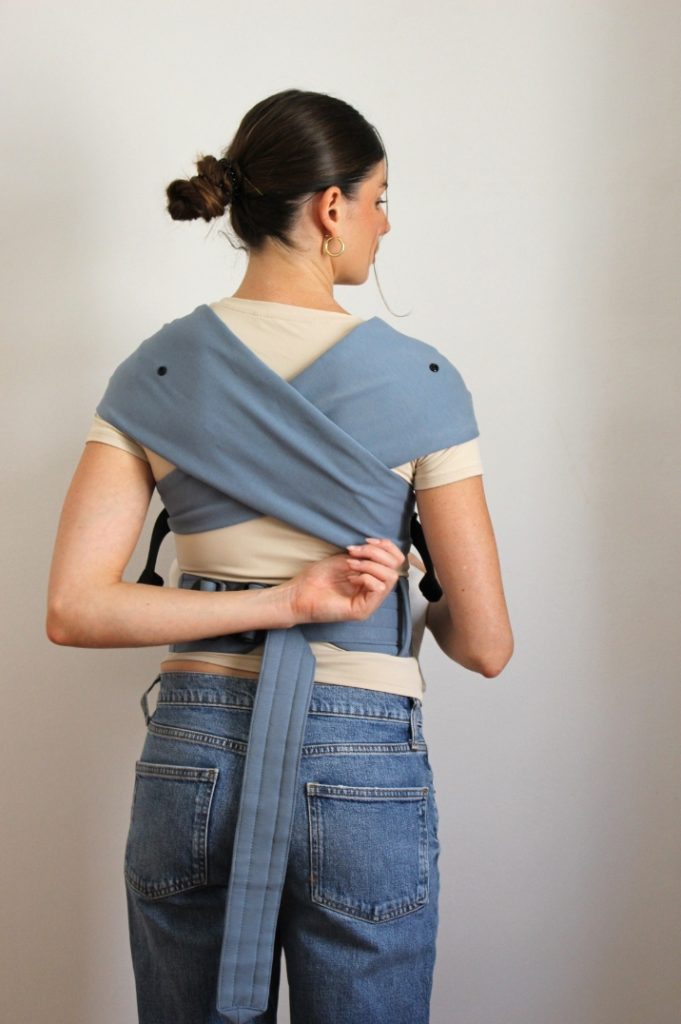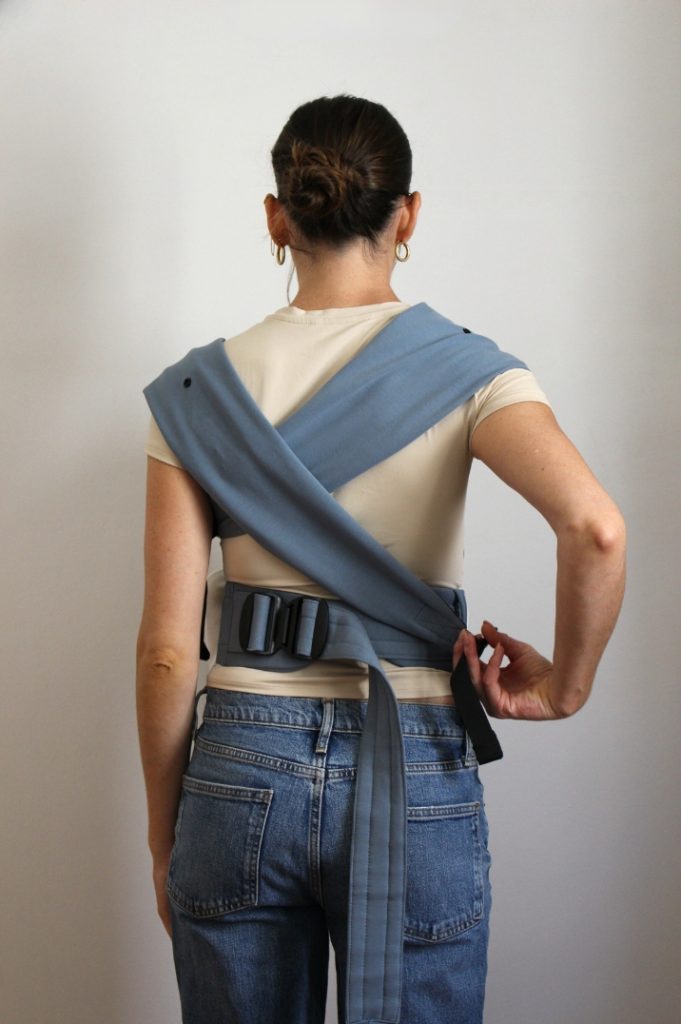 Coloca el cinturón asegurándote de que la etiqueta de advertencia quede hacia adentro y el panel del portabebés quede centrado en tu cuerpo.