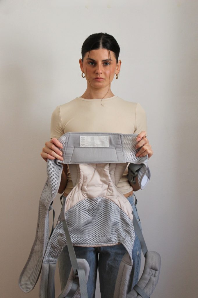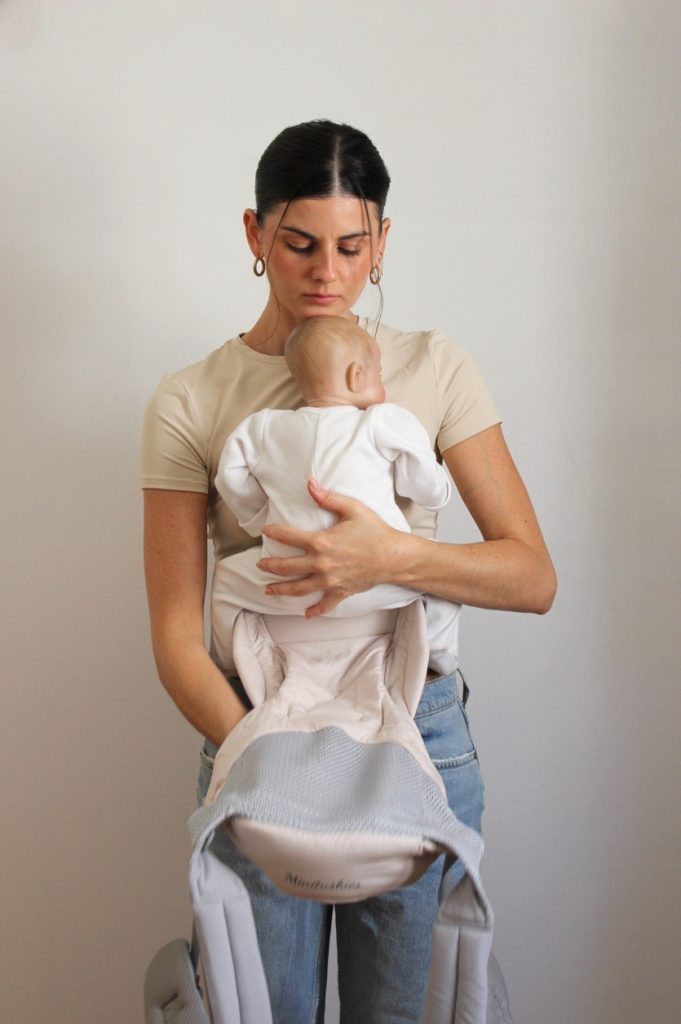 Colócate el asa de un lado usando la mano de ese mismo lado, sin dejar de sujetar al peque con la mano contraria.