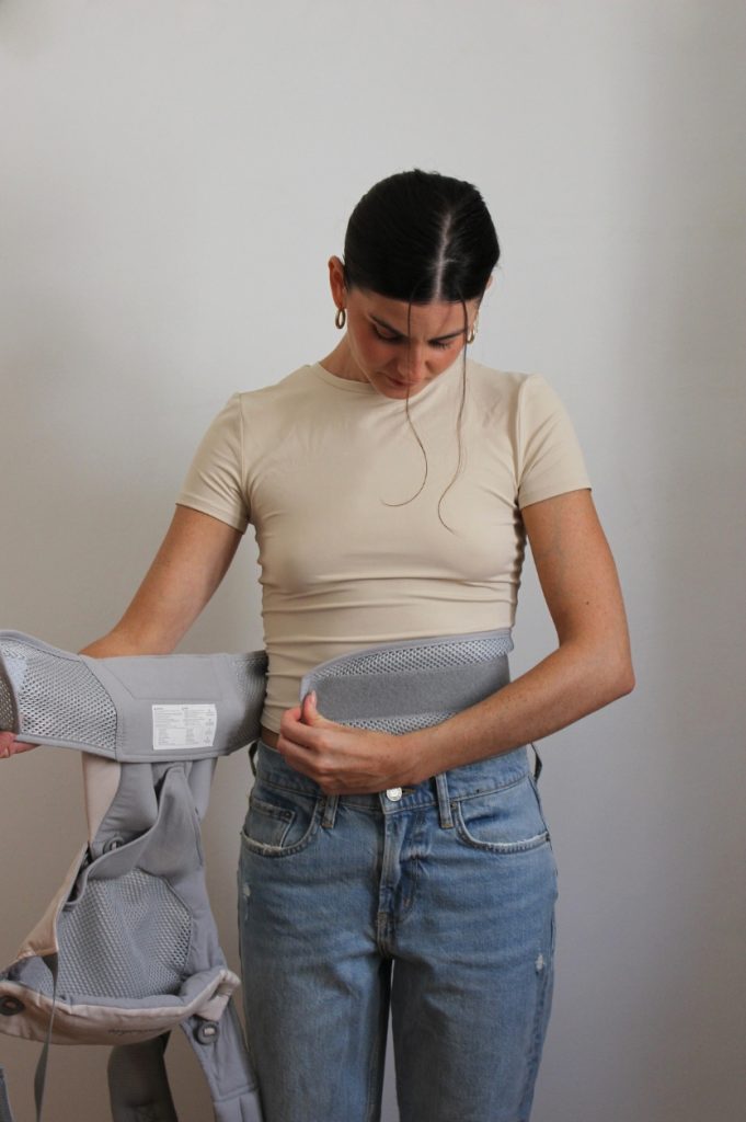 Coloca el cinturón asegurándote de que la etiqueta de advertencia quede hacia adentro y el panel del portabebés quede centrado en tu cuerpo.