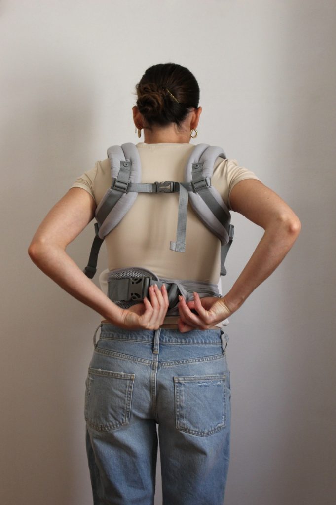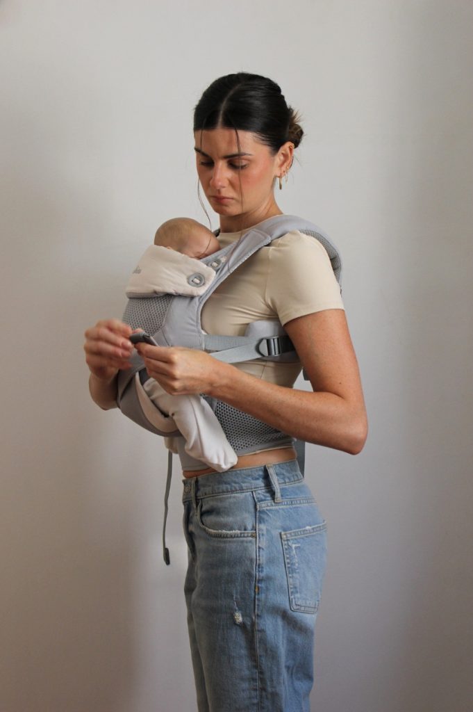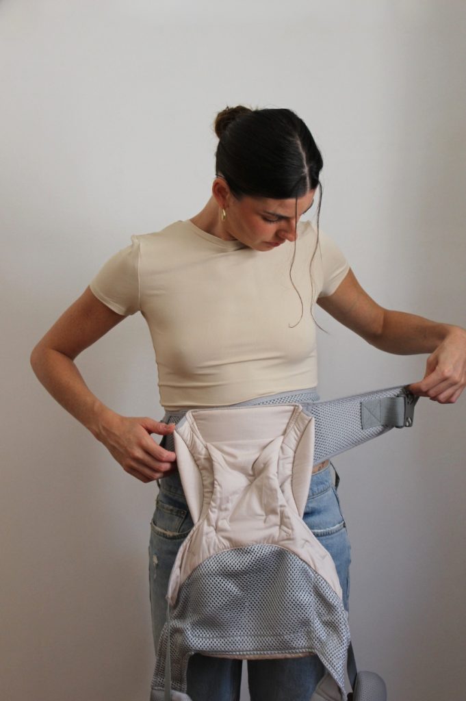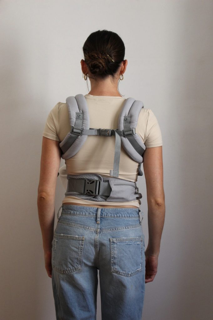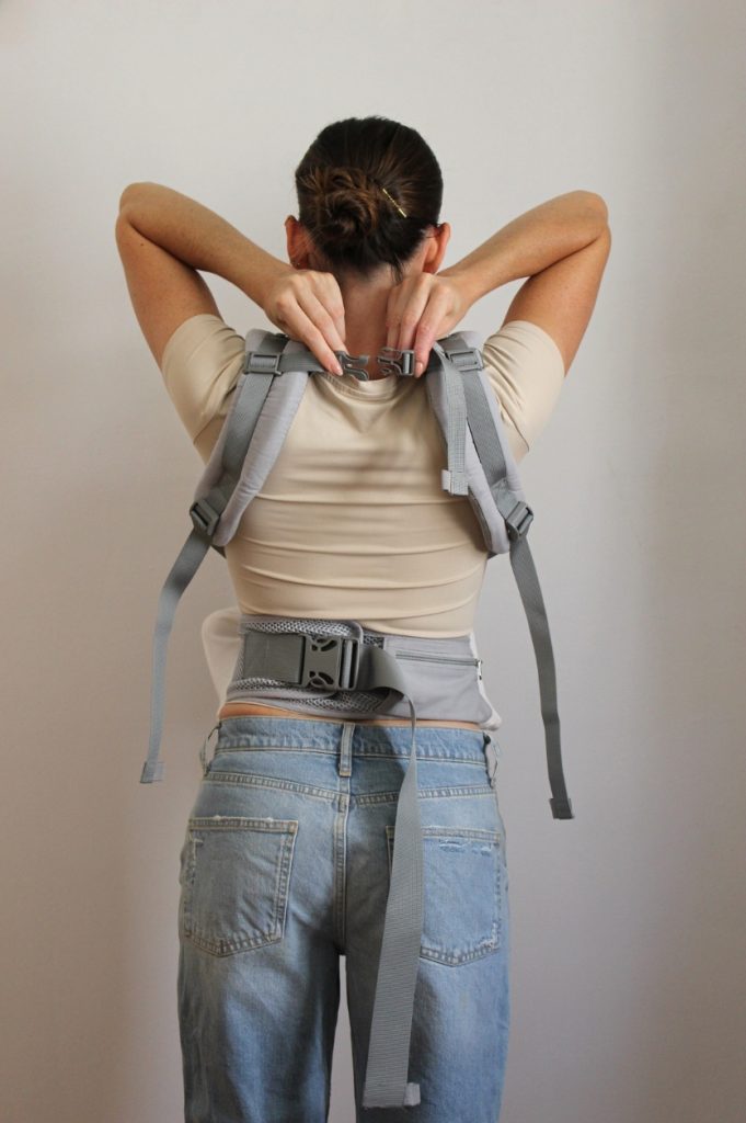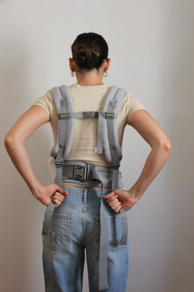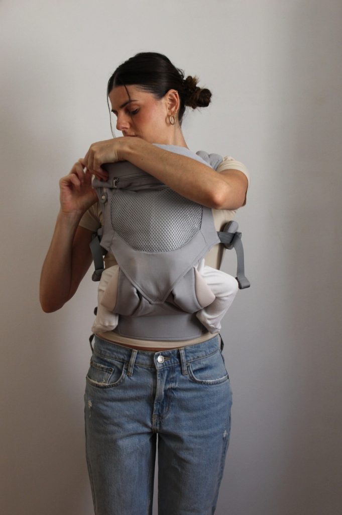 Ajusta ambas asas simultáneamente. Asegúrate de que tu peque esté cómodo y no demasiado apretado contra tu cuerpo, dejando espacio para que pueda mover la cabeza.