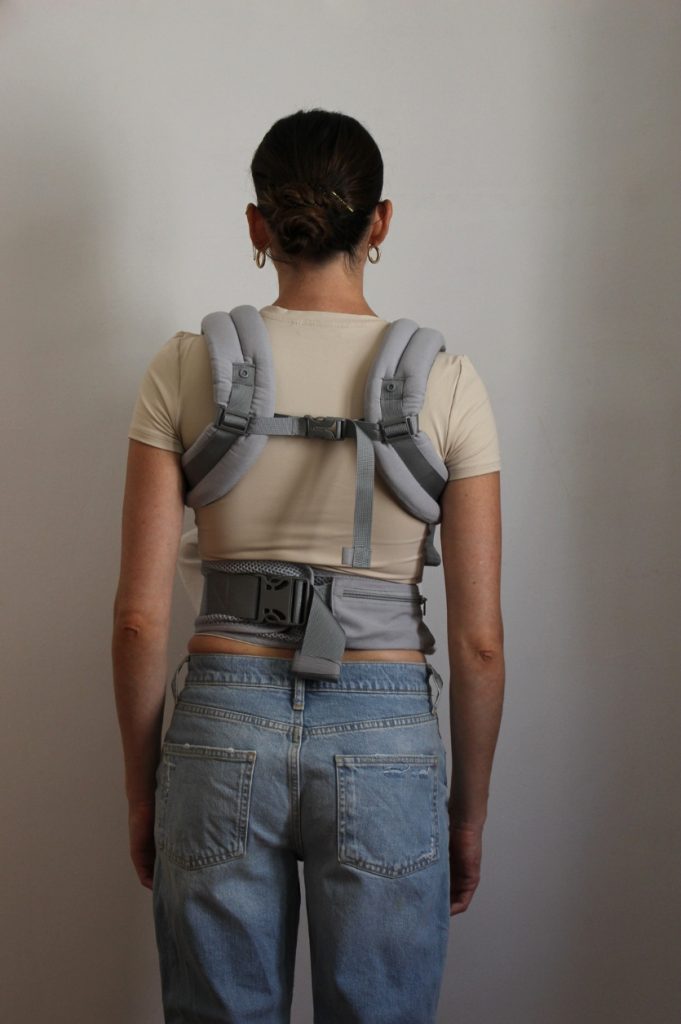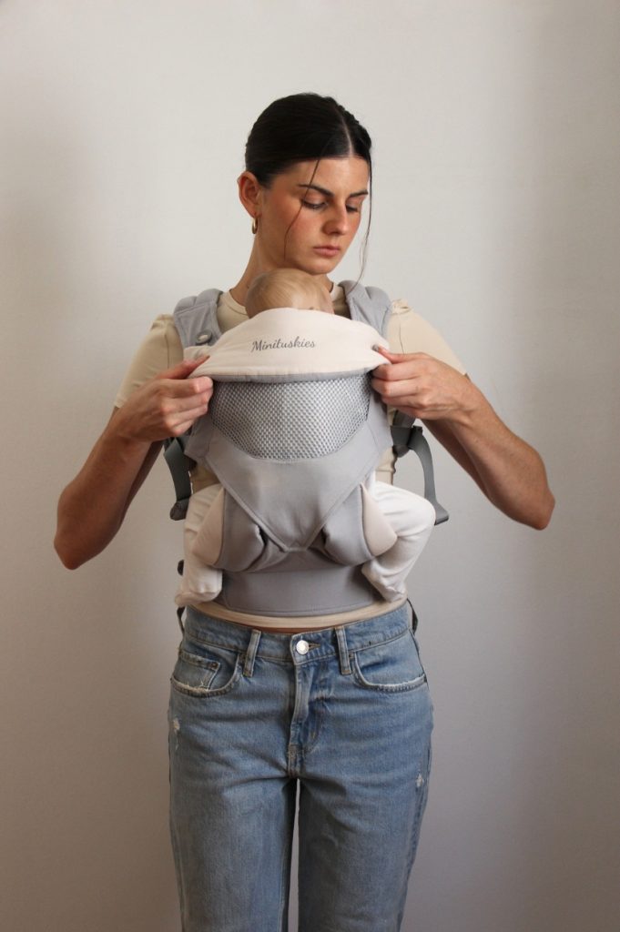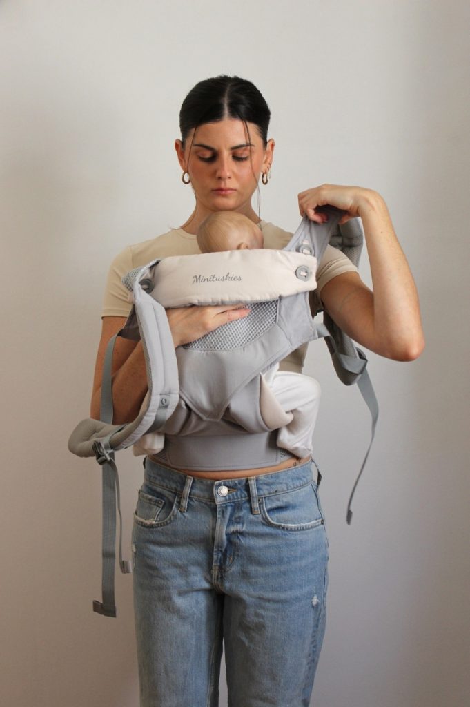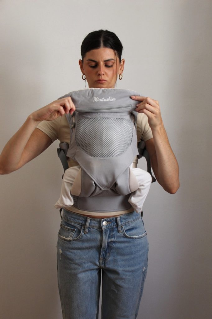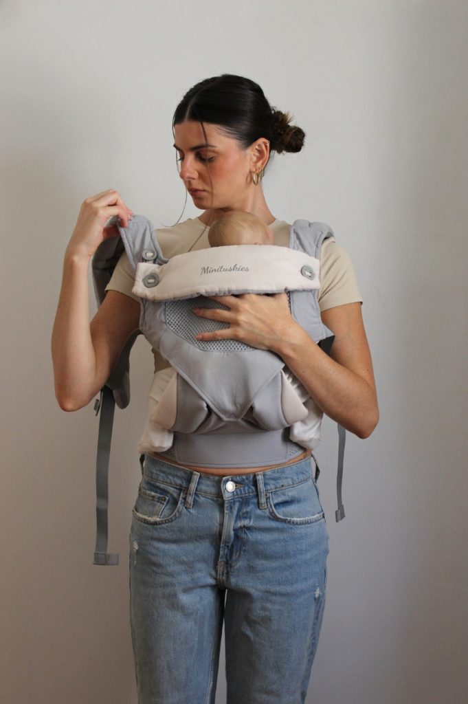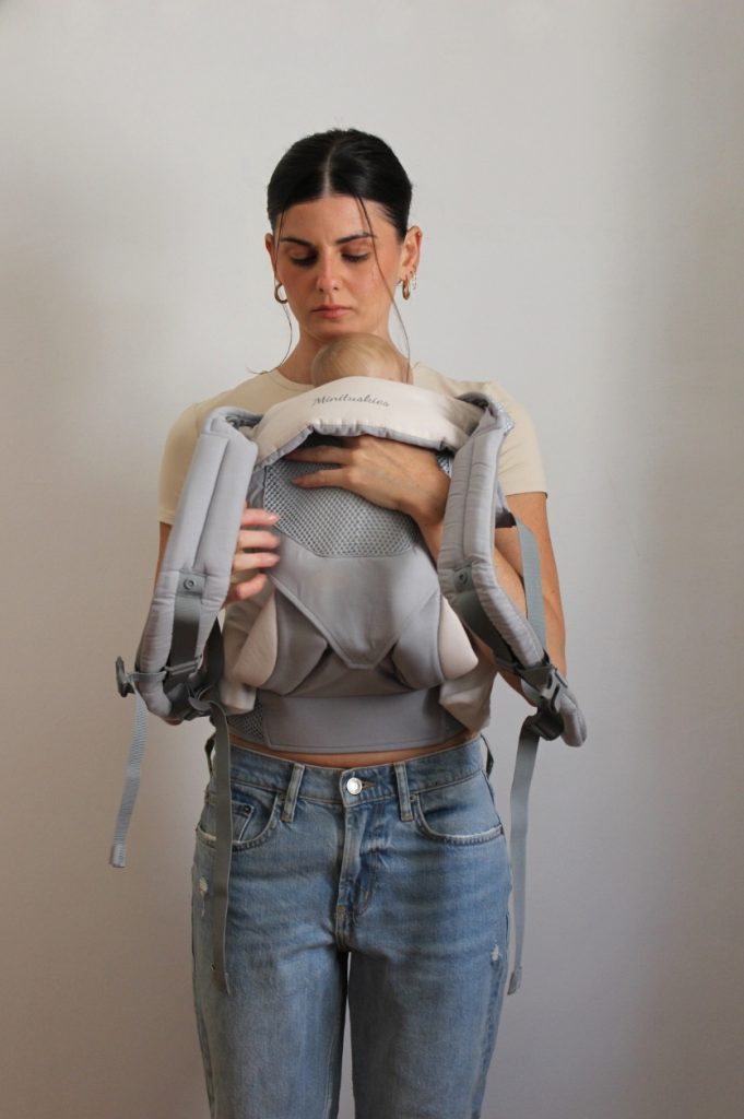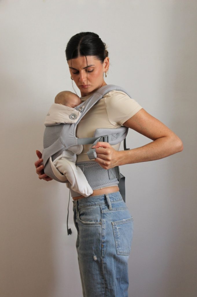 Ajusta ambas asas simultáneamente. Asegúrate de que tu peque esté cómodo y no demasiado apretado contra tu cuerpo, dejando espacio para que pueda mover la cabeza.