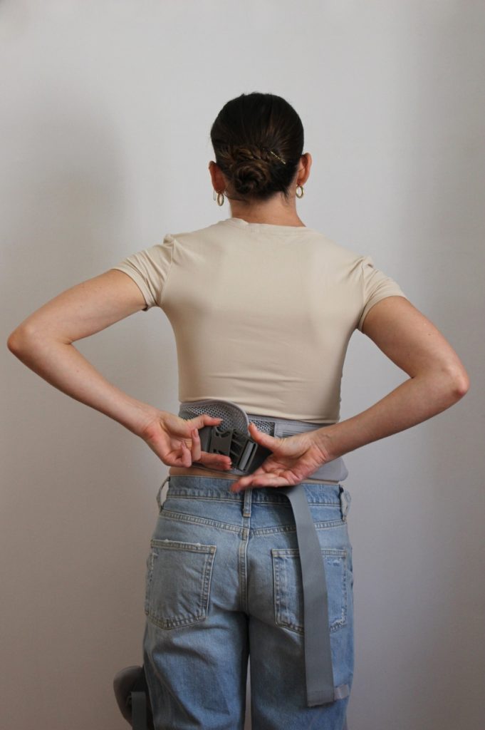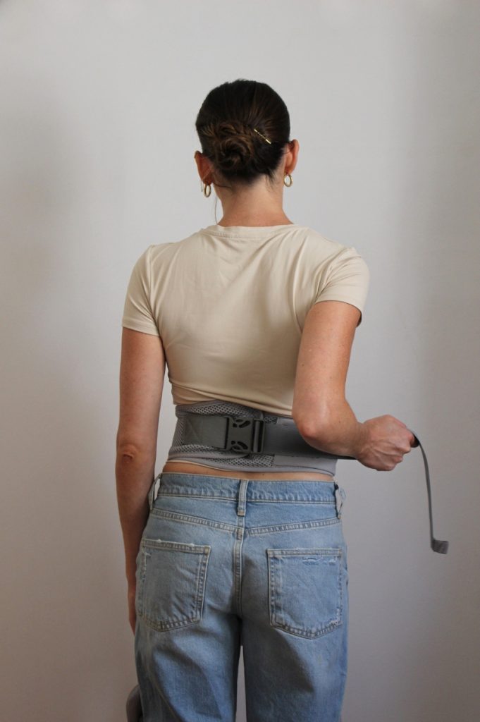 Comienza colocando el extremo izquierdo del cinturón lumbar, quedando el velcro hacia fuera.